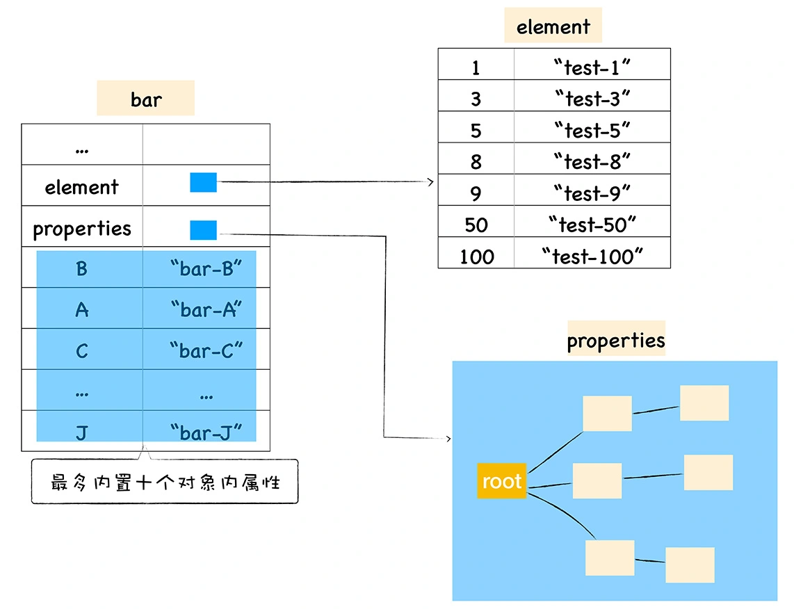 - 对象内属性:有两种策略。快属性策略:属性比较少时,直接存放在对象内。慢属性策略:属性超过10个,多出来的属性将被存储到properties属性中。